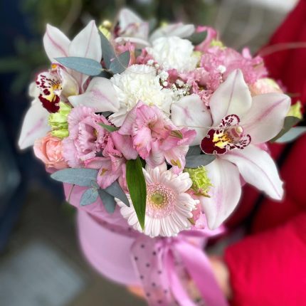 Авторский букет с пионовидными розами, пионом и Герберами «Айс латте»
