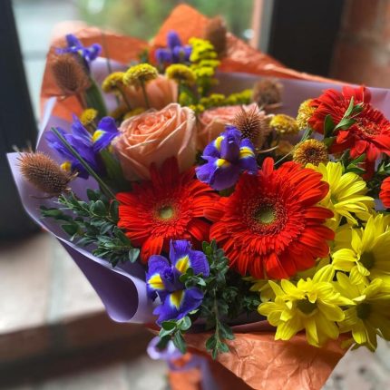 Букет из лилии, хлопка, эустомы, роз, диантусов, ирисов, кустовой хризантемы и самшита в стильной упаковке “Джун Осборн”