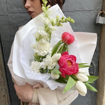 Раскидистый букет с пионами корал шарм и белыми тюльпанами / 1365 id
