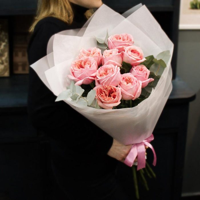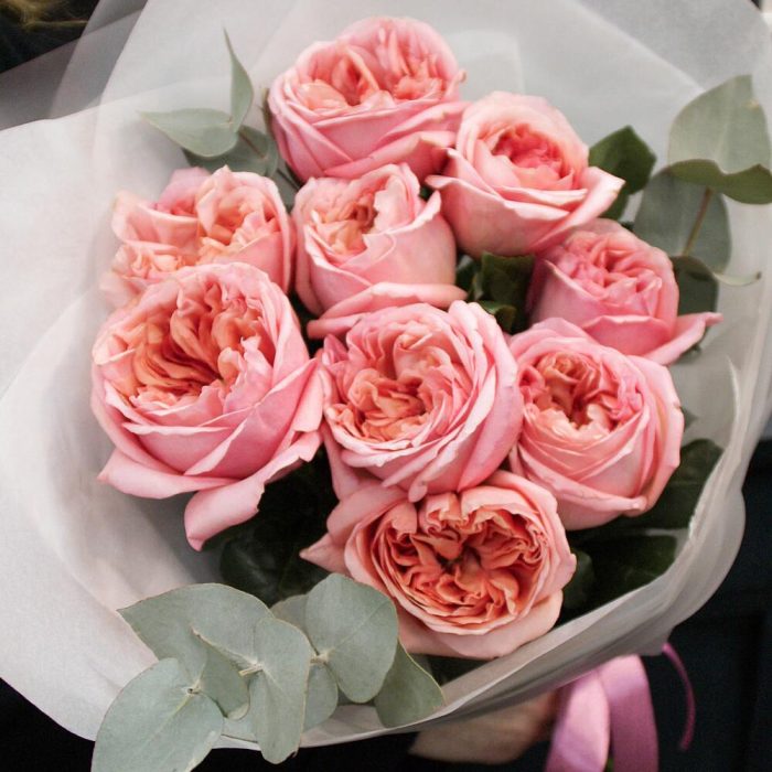 Эвкалипт – 2 шт.Тишью – 1 шт.Атласная лента – 2 шт.Матовая пленка – 1 шт.пионовидные розы – 9 шт.