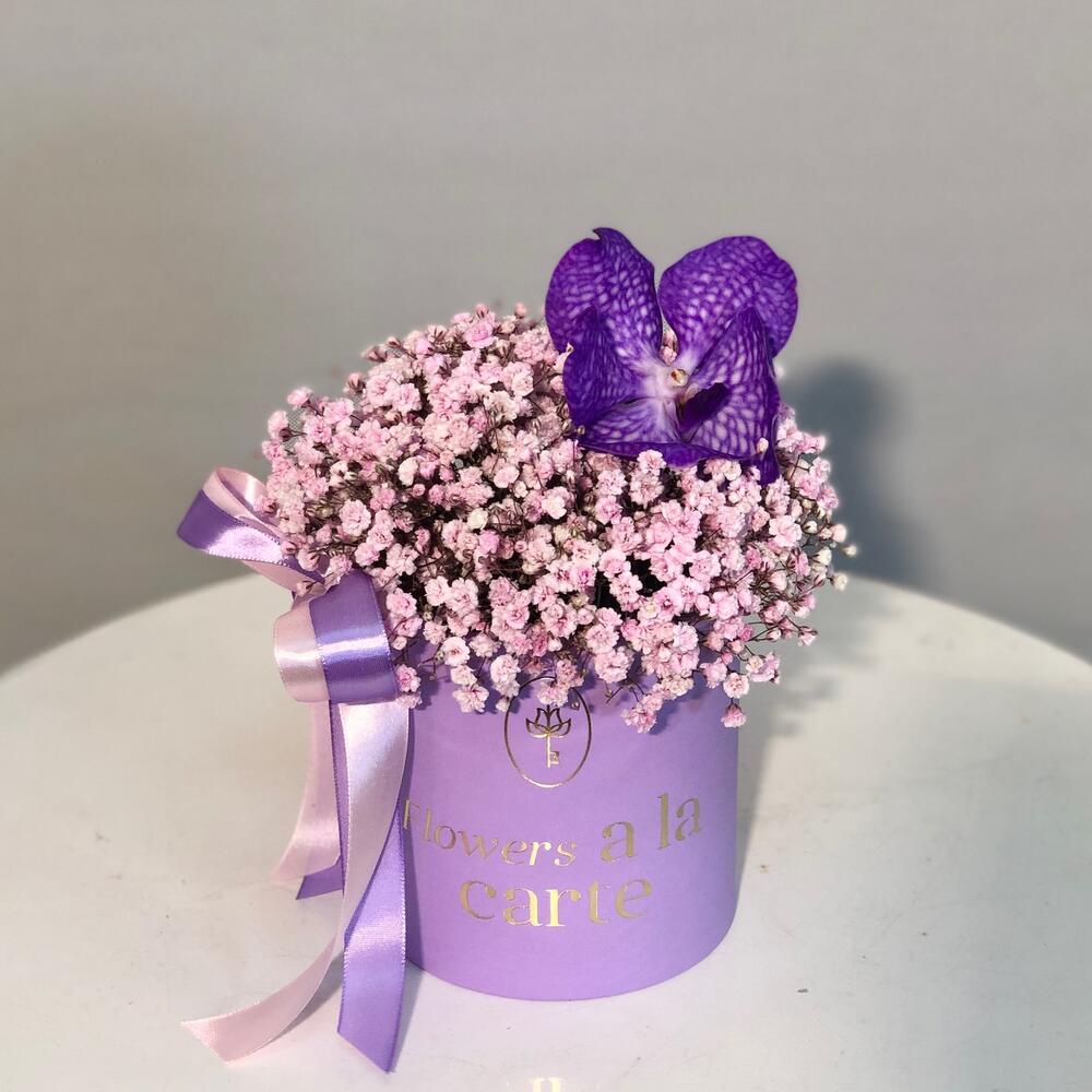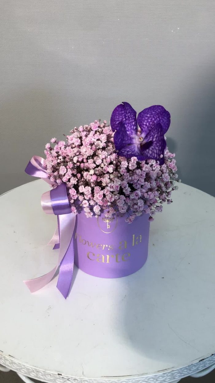 Гипсофила – 4 шт.Орхидея Ванда – 1 шт.Лента атласная – 2 шт.Оазис флористический – 1 шт.коробка шляпная маленькая – 1 шт.