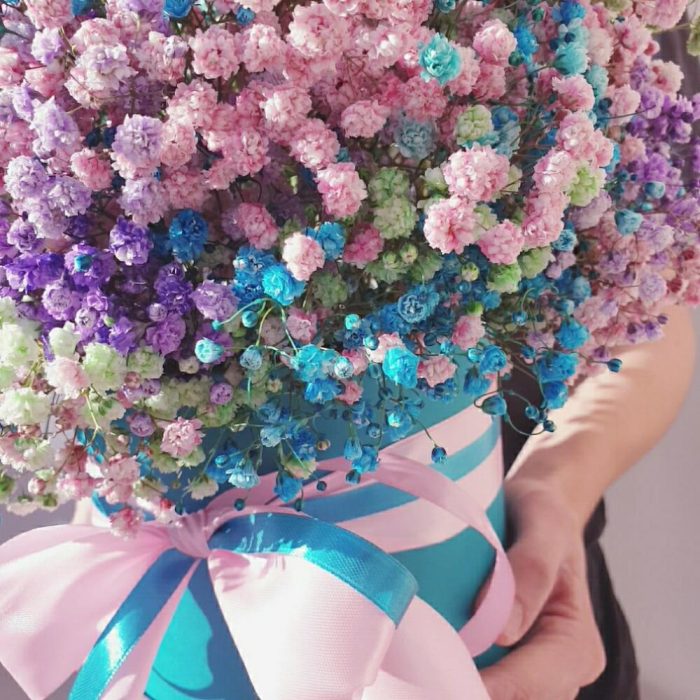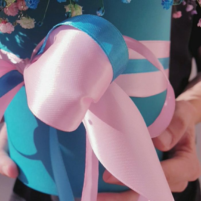 Цветочная композиция в шляпной коробке с голубой гипсофилой "Майолика"