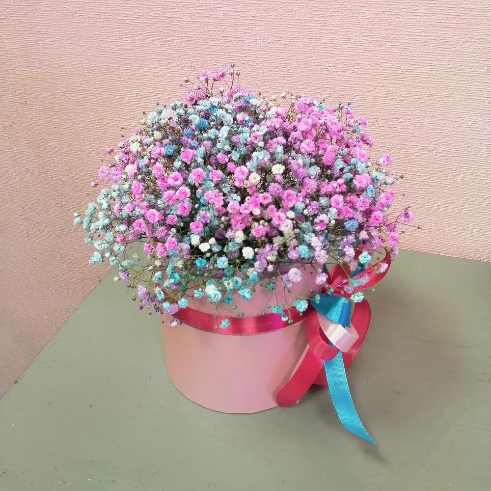 Коробка шляпная – 1 шт.Оазис флористический – 1 шт.гипсофила радужная – 6 шт.