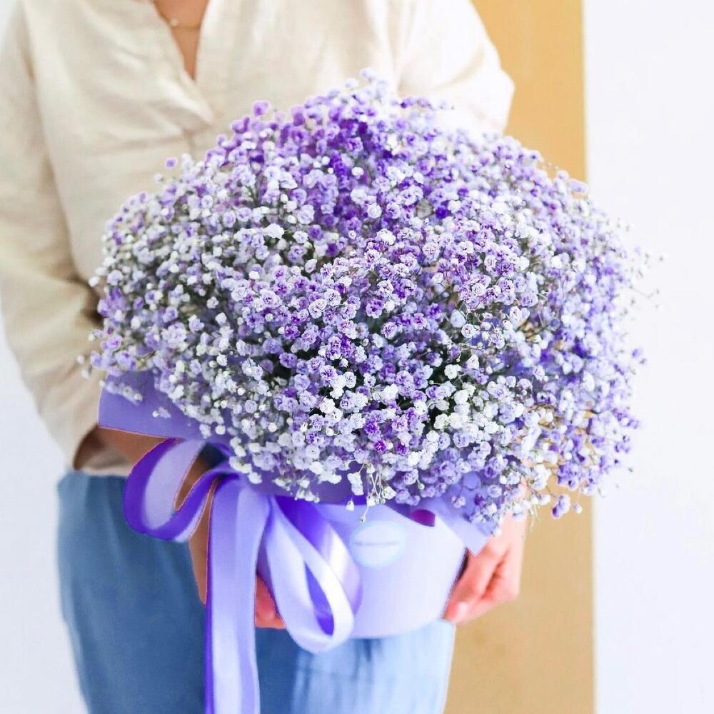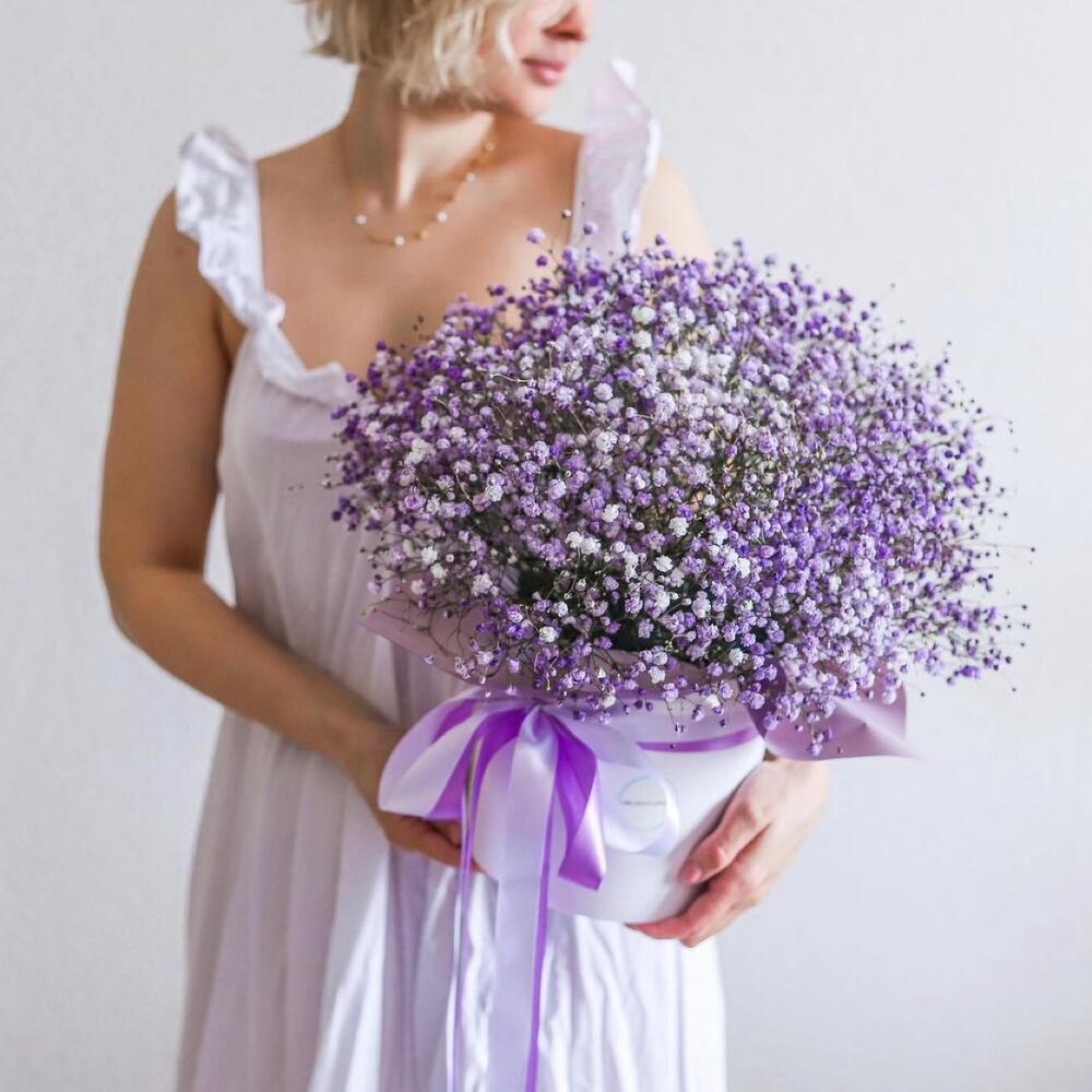 гипсофила цветная – 11 шт.Коробка шляпная – 1 шт.Лента атласная – 2 шт.Пленка дизайнерская – 1 шт.Губка флористическая – 3 шт.Упаковка транспортировочная пленка – 1 шт.инструкция по уходу за цветами – 1 шт.