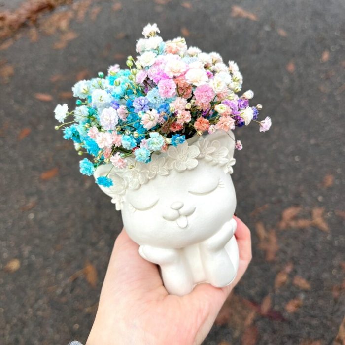Открыточка с вашими пожеланиями – 1 шт. гипсофила радужная – 1 шт. кашпо из гипса ручной работы – 1 шт.