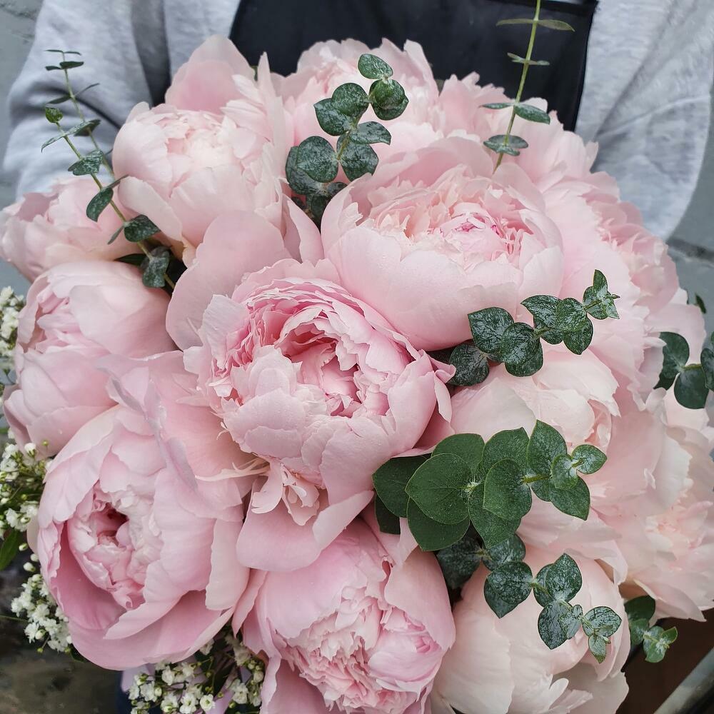 Пион – 19 шт.Эвкалипт – 5 шт.Гипсофила – 2 шт.Фисташка – 3 шт.Лента атласная – 1 шт.
