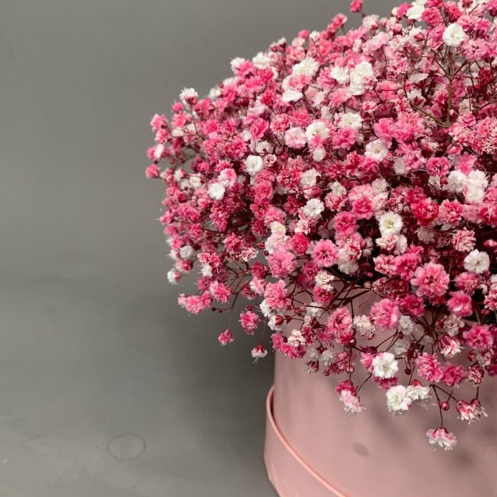 “Сиреневый туман” – композиция из гипсофилы в шляпной коробке