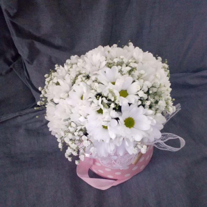 Ромашка – 25 шт.Гипсофила – 9 шт.Шляпная коробка – 1 шт.Флористическая губка – 1 шт.Лента – 1 шт.