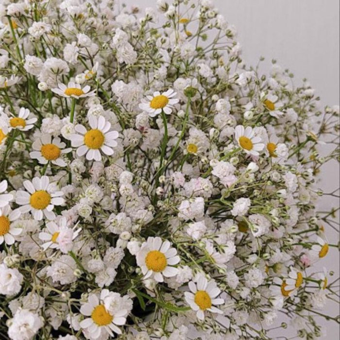 Гипсофила – 7 шт.Ромашка кустовая – 7 шт.Шляпная коробка – 1 шт.Тишью – 1 шт.