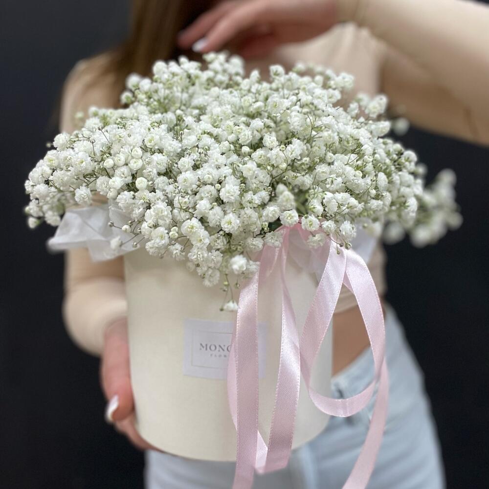 Гипсофила – 5 шт.Оазис флористический – 1 шт.Шляпная коробка – 1 шт.Лента атласная – 1 шт.наклейка фирменная – 1 шт.