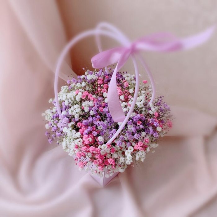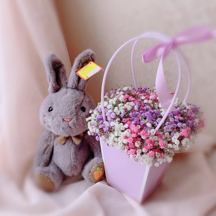 Лента атласная – 1 шт.Сумочка – 1 шт.Флористическая губка – 1 шт.Мягкая игрушка зайка – 1 шт.радужная гипсофила – 5 шт.
