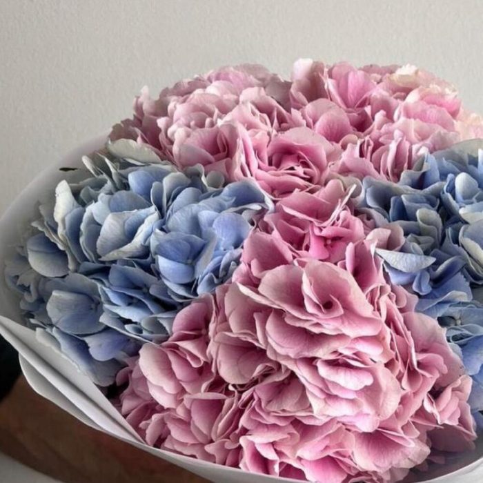 Гортензия розовая – 3 шт.Гортензия голубая – 2 шт.Упаковка дизайнерская – 1 шт.Лента атласная – 2 шт.Открыточка с вашими пожеланиями – 1 шт.хорошее настроение – 100 шт.инструкция по уходу за цветами – 1 шт.коробка переноска – 1 шт.Кризал – 1 шт.