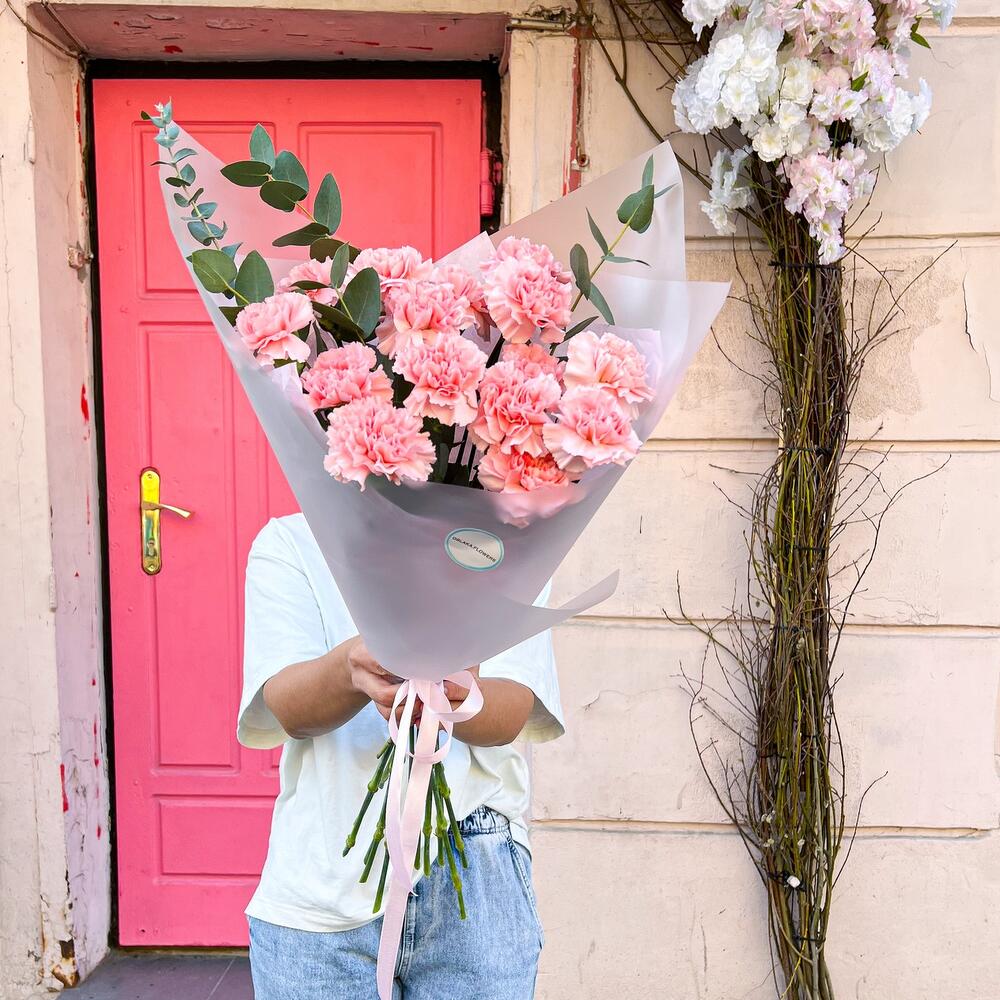 Диантус сортовой – 15 шт.Эвкалипт – 2 шт.Тишью – 1 шт.Корейская пленка – 2 шт.Лента атласная – 1 шт.Аквапак – 1 шт.
