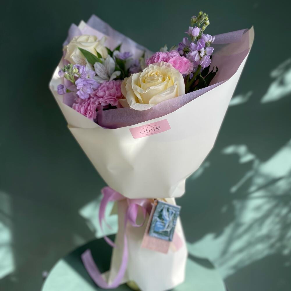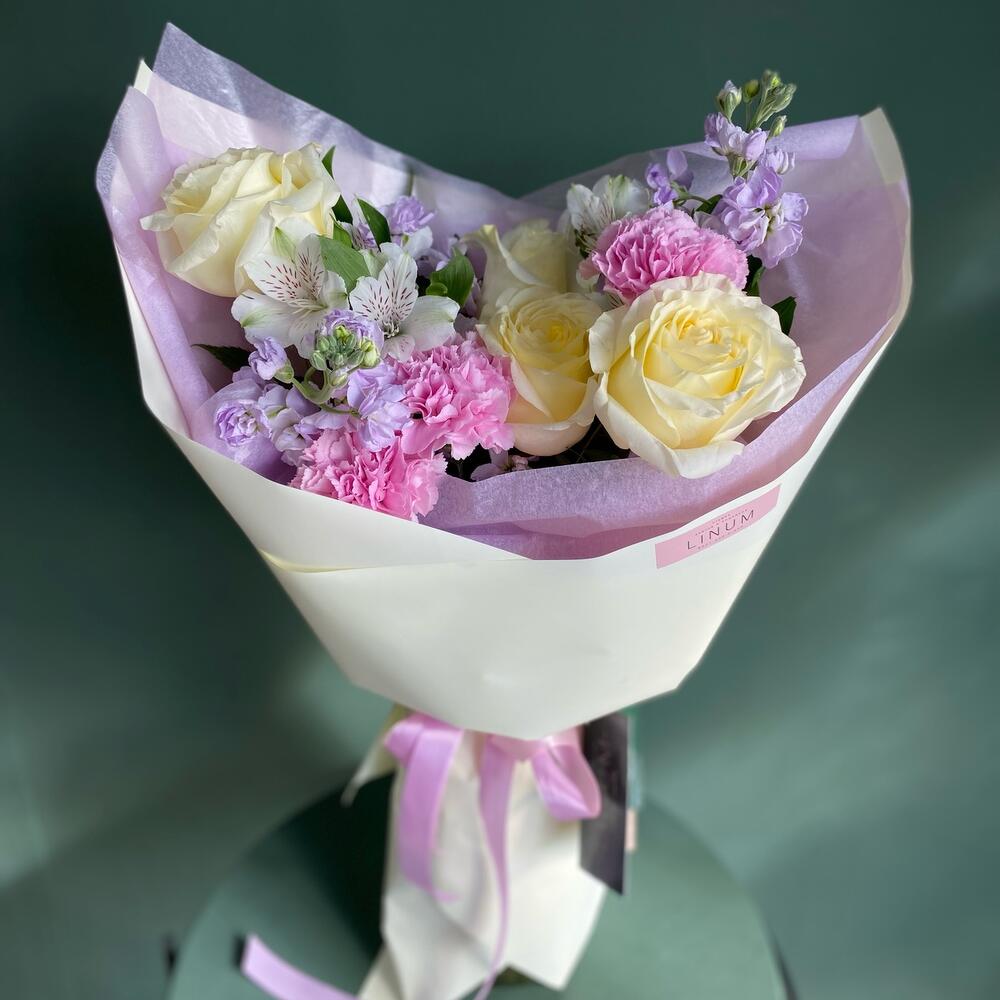роза кендилайт – 4 шт.Маттиола – 4 шт.Гвоздика – 3 шт.Альстромерия – 2 шт.Упаковка дизайнерская – 1 шт.Открыточка с вашими пожеланиями – 1 шт.транспортировочная упаковка – 1 шт.уходовое средство для цветов – 1 шт.