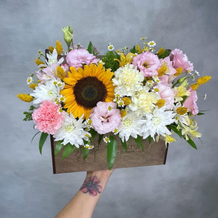 Альстромерия – 5 шт.Лизиантус – 4 шт.Рускус – 2 шт.Гвоздика – 5 шт.Подсолнух – 1 шт.Матрикария – 3 шт.Фаларис – 20 шт.