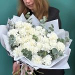 Эвкалипт – 1 шт.Лента атласная – 2 шт.современная упаковка с тишью – 2 шт.диантус сортовой (гвоздика) – 25 шт.