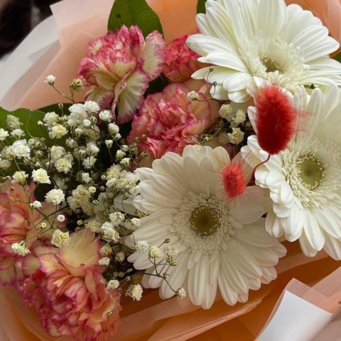 гербера белая мини – 3 шт.Гвоздика сортовая – 5 шт.Гипсофила – 1 шт.Салал пучок – 1 шт.Лагурус – 3 шт.Тишью – 4 шт.Пленка матовая – 6 шт.