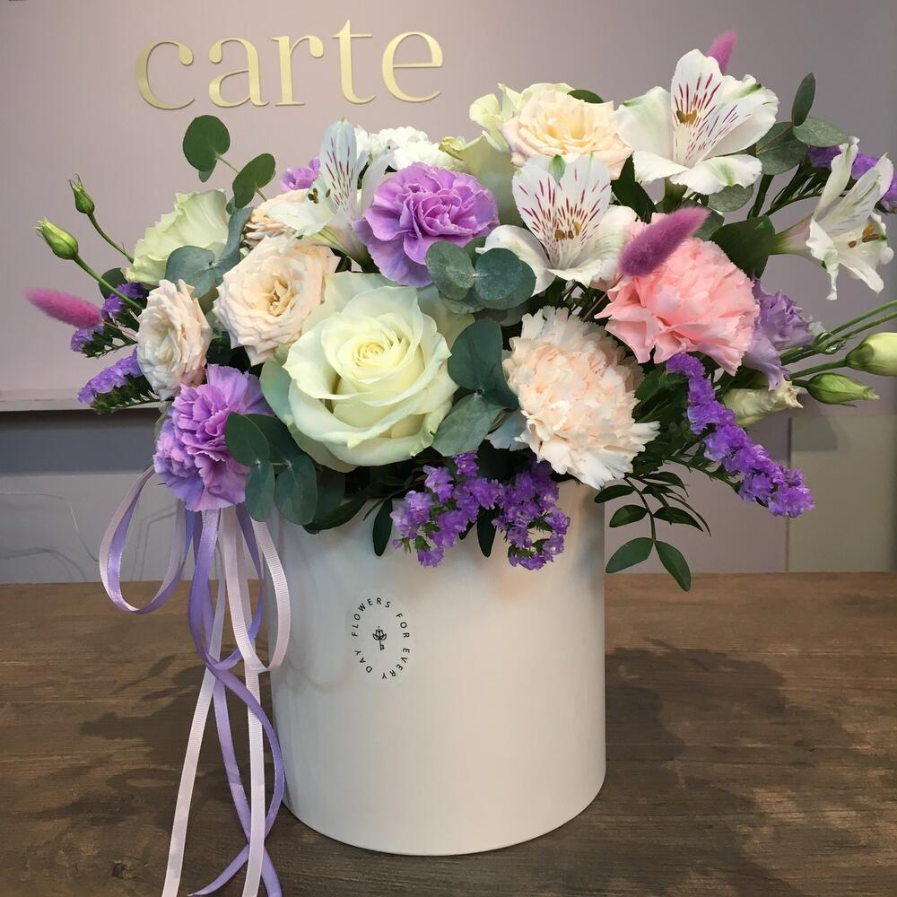 Шляпная коробка – 1 шт.Оазис флористический – 1 шт.Роза Эквадор – 3 шт.Роза кустовая – 2 шт.Гвоздика – 5 шт.Лагурус (сухоцвет) – 1 шт.Статица – 1 шт.эваклипт – 1 шт.Фисташка – 1 шт.Альстромерия – 2 шт.