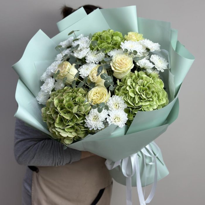 Роскошный букет из гортензии, роз, альстремерий и хризантем