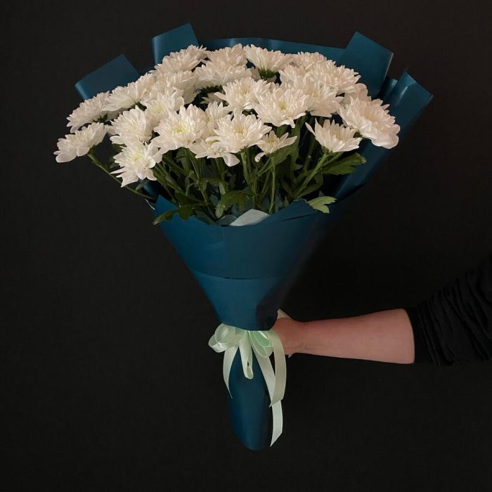 Хризантема Балтика – 7 шт. салфетка декоративная – 4 шт. Тишью – 2 шт. Лента атласная – 2 шт. Слюда упаковка – 2 шт.