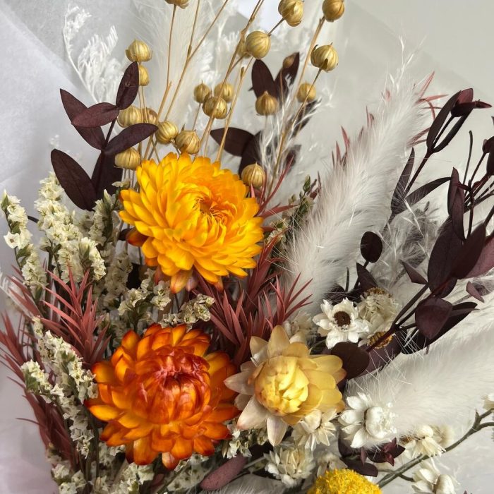 Упаковка дизайнерская – 1 шт.Гелихризум – 3 шт.Краспедия – 2 шт.аммобиум – 1 шт.Лагурус – 7 шт.Лен – 1 шт.Эвкалипт – 1 шт.пампасная трава – 1 шт.