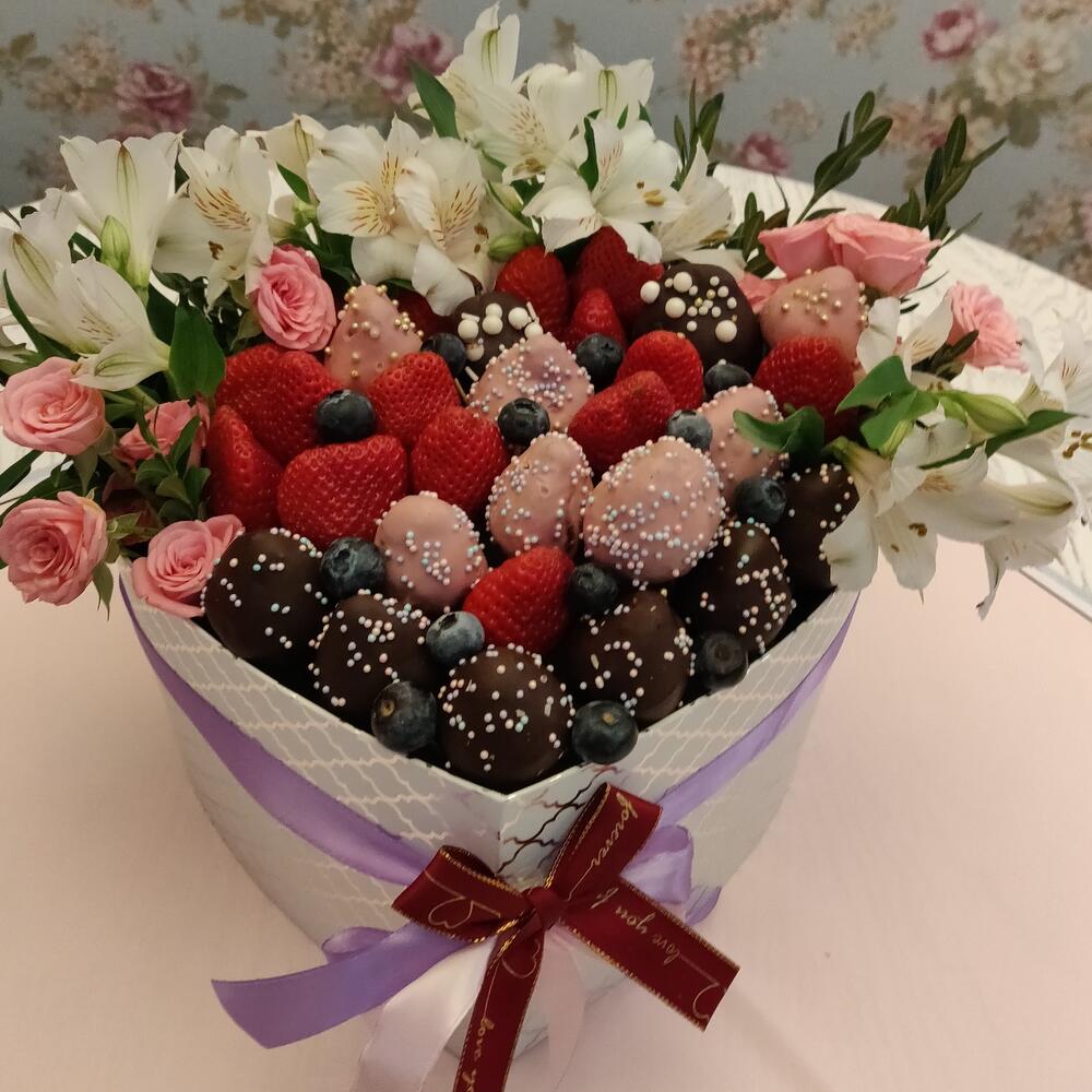 Альстромерия – 5 шт.Клубника – 300 гр.Роза кустовая – 4 шт.Коробка сердце – 1 шт.Клубника в шоколаде – 350 гр.зелень декоративная – 1 шт.
