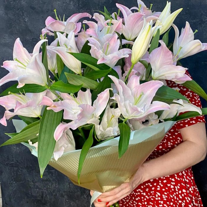 Лента атласная – 1 шт.Лилия розовая – 7 шт.Упаковка дизайнерская – 1 шт.