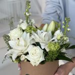 Белоснежная композиция с лилиями и розами
