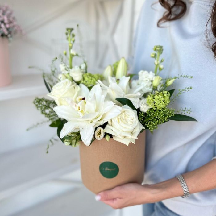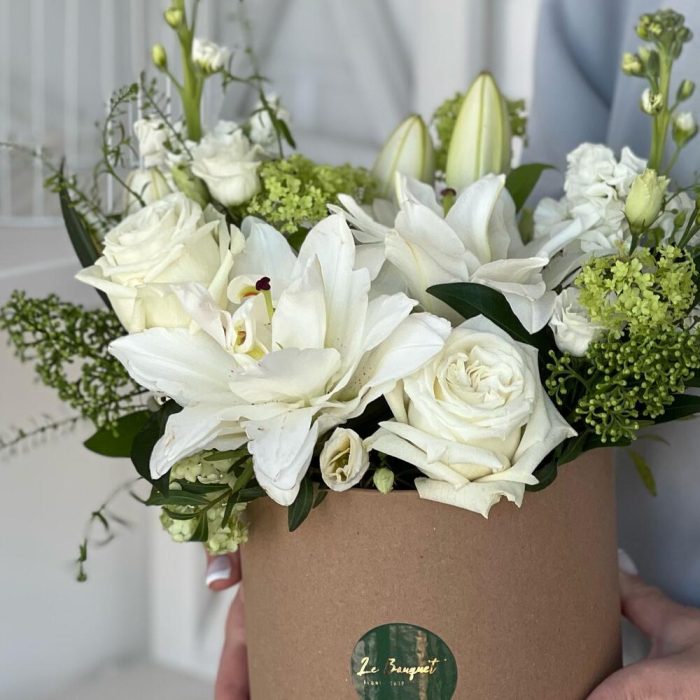 Белоснежная композиция с лилиями и розами