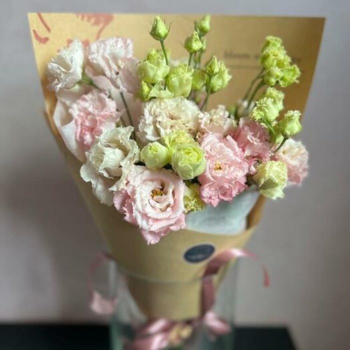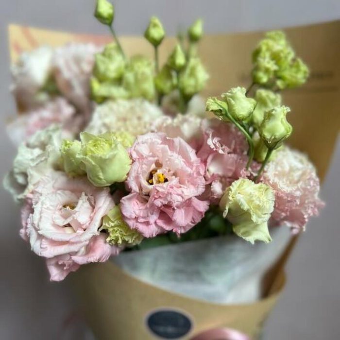 Лизиантус (эустома) – 7 шт.декоративная упаковка – 1 шт.Атласная лента – 1 шт.