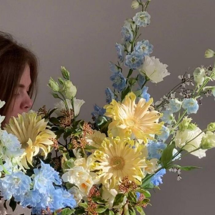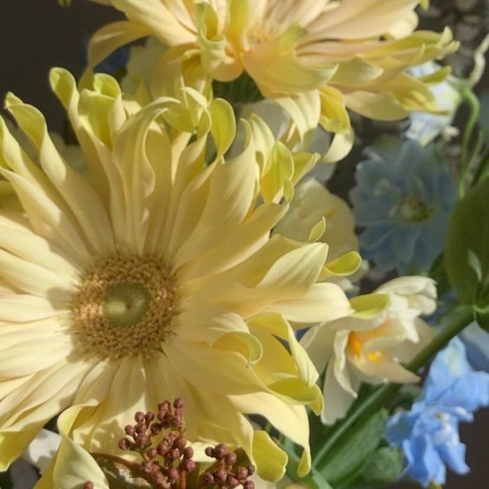 Дельфиниум – 3 шт.Нарцисс – 3 шт.гербера паста карбонара – 5 шт.Лизиантус – 4 шт.Гениста – 2 шт.Вибурнум – 3 шт.Лента – 1 шт.