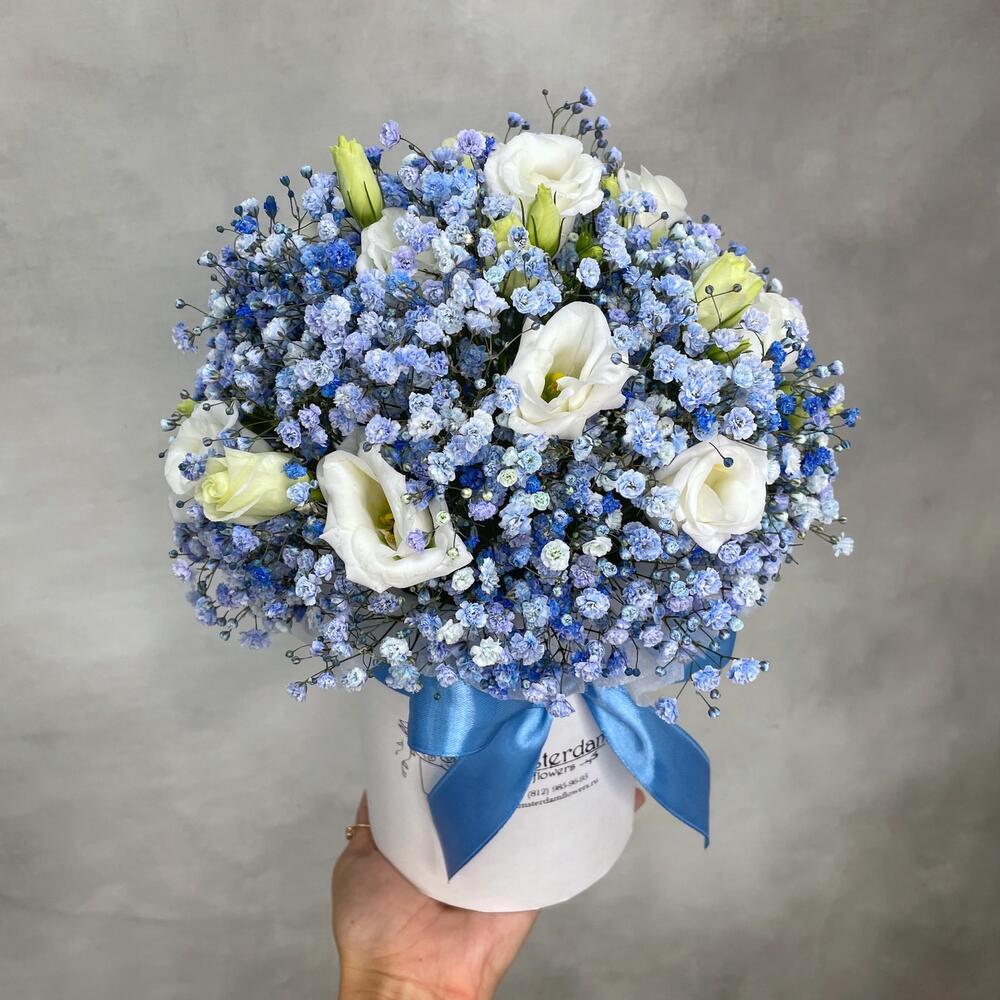 Гипсофила – 6 шт.Лизиантус – 5 шт.Коробка шляпная – 1 шт.Оазис флористический – 1 шт.