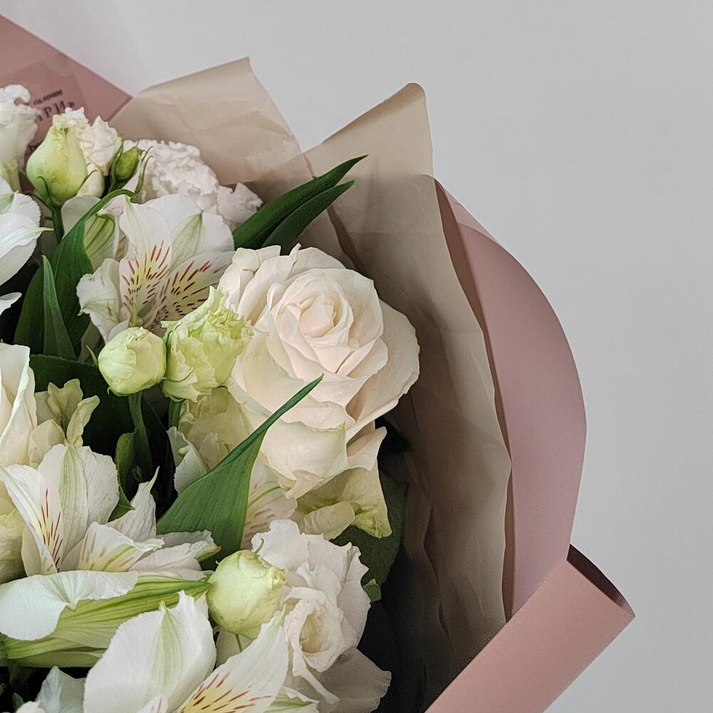 Сборный букет с белыми розами, белоснежной эустомой, стойкой альстромерией в стильной корейской упаковке