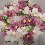 Орхидея Цимбидиум ветка – 2 шт.Коробка шляпная – 1 шт.Фисташка пучок – 1 шт.Оазис флористический – 2 шт.бант атласный – 1 шт.