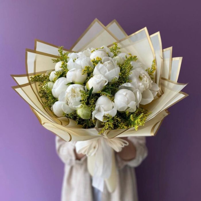 Пион белый – 21 шт.Мимоза – 16 шт.Упаковка дизайнерская – 2 шт.Лента атласная – 2 шт.Открыточка с вашими пожеланиями – 1 шт.хорошее настроение – 100 шт.инструкция по уходу за цветами – 1 шт.коробка переноска – 1 шт.Кризал – 1 шт.