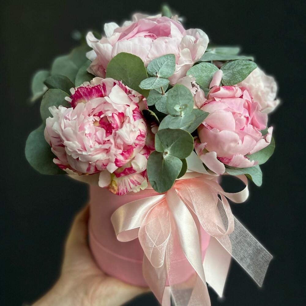 Коробка шляпная – 1 шт.Флористическая губка (оазис) – 1 шт.пионы – 5 шт.Эвкалипт – 5 шт.Атласная лента – 1 шт.