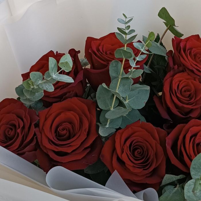 роза эквадор 70 см красная – 9 шт. Эвкалипт Микс – 3 шт. Упаковка дизайнерская – 1 шт.
