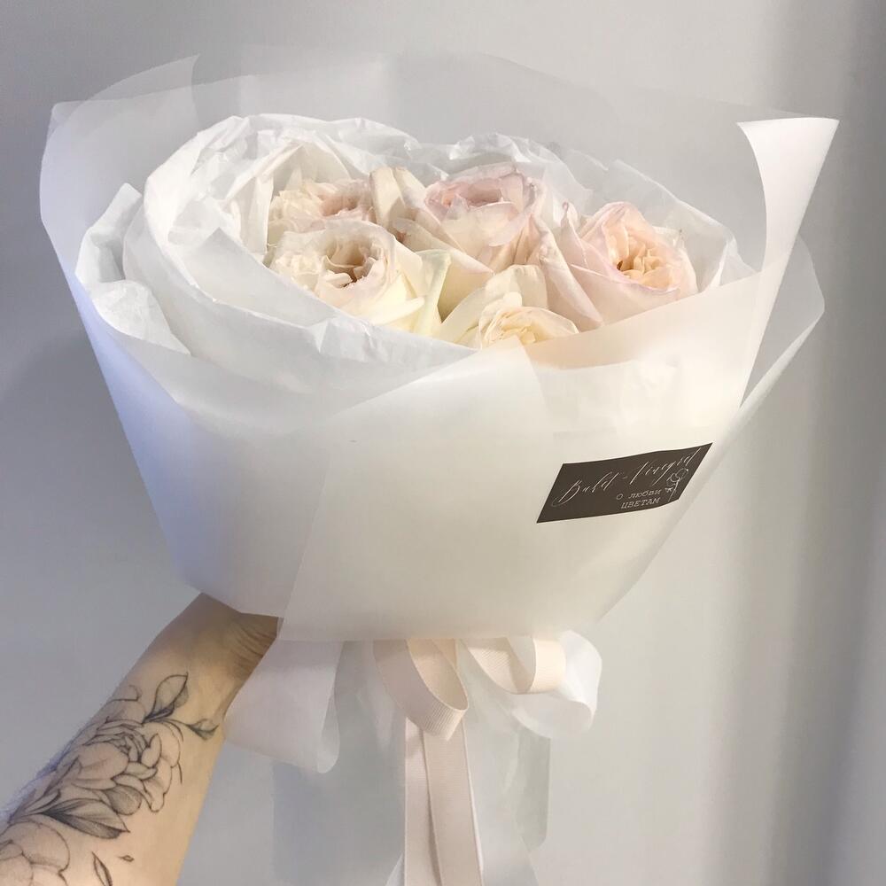 Лента атласная – 2 шт.Тишью – 3 шт.Аквабокс – 1 шт.Средство для продления жизни цветов – 1 шт.Карточка для подписи – 1 шт.Матовая упаковка – 2 шт.роза пионовидная вайт o’hara ароматная – 5 шт.чек лист по уходу за цветами – 1 шт.
