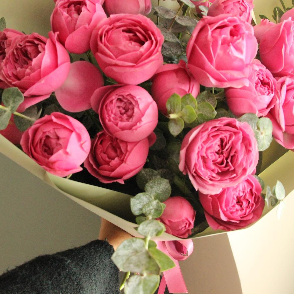 Роза кустовая пионовидная – 9 шт.Эвкалипт – 5 шт.Упаковка – 3 шт.Лента атласная – 2 шт.