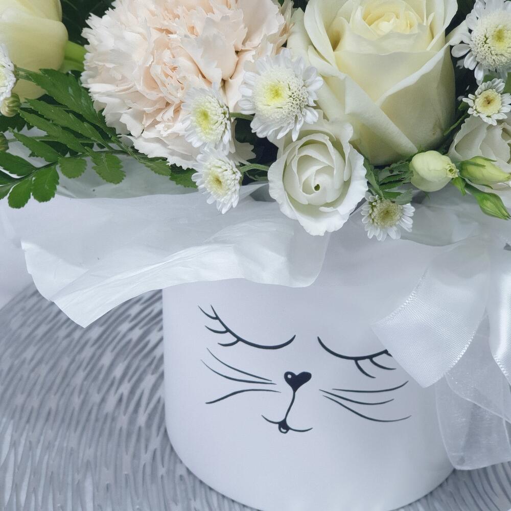 Белые цветы в коробке с котиком
