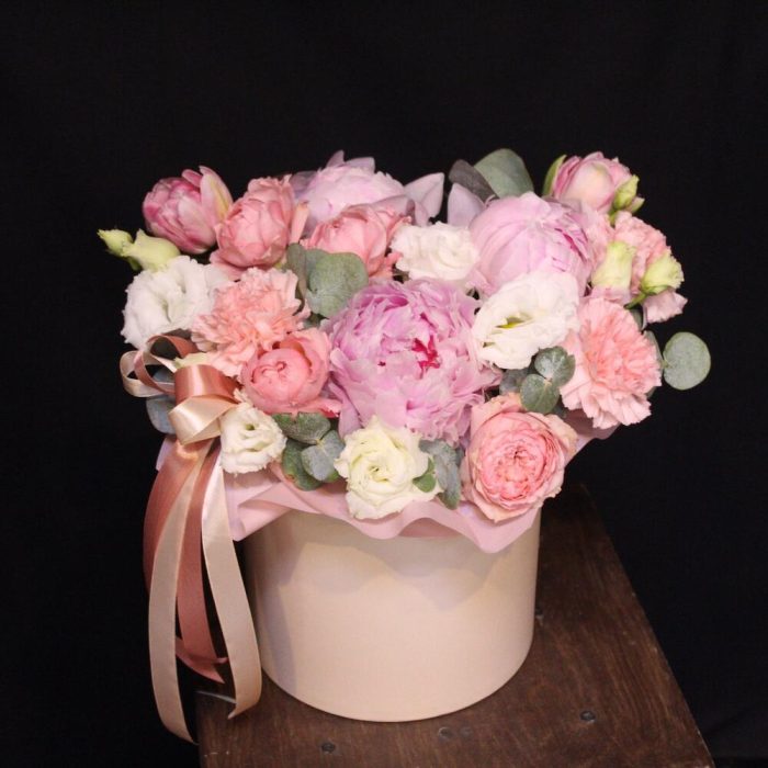 Эвкалипт – 1 шт.Эустома – 2 шт.Лента атласная – 1 шт.Диантус – 3 шт.Шляпная коробка – 1 шт.Пион Сара Бернар – 3 шт.Оазис флористический – 1 шт.Пленка дизайнерская – 1 шт.Роза кустовая пионовидная джульетта – 1 шт.тюльпан пионовидный фокстрот – 2 шт.