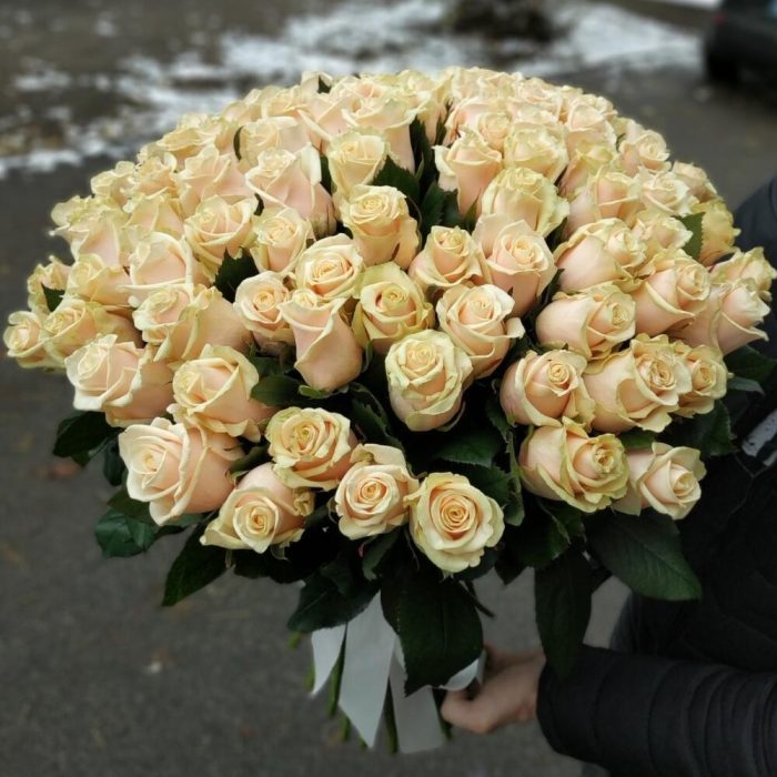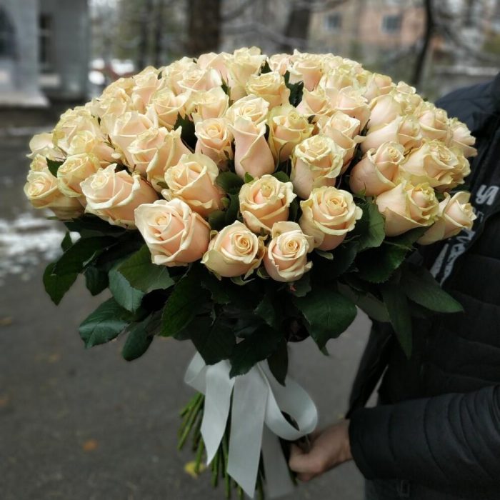 роза украинская кремовая – 101 шт. Оформление лента атласная – 1 шт.