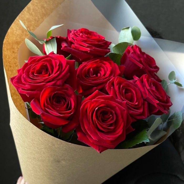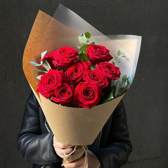 Эвкалипт – 3 шт.Упаковка дизайнерская – 3 шт.Роза красная 50 см – 9 шт.