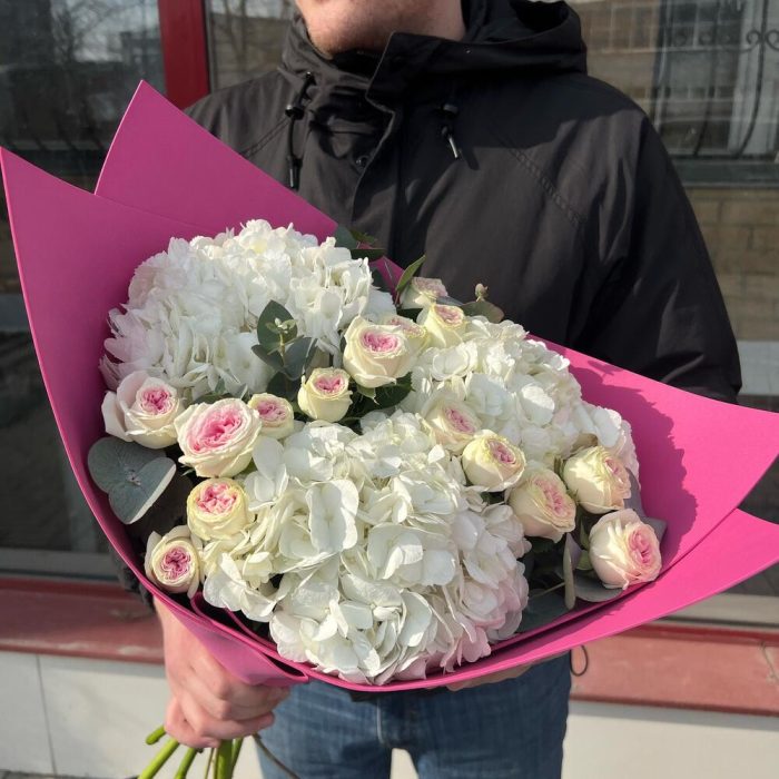 Букет гортензий с пионовидными розами и эвкалиптом