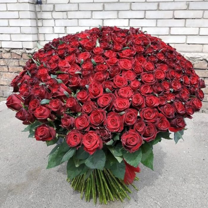 роза украинская красная – 251 шт. Оформление лента атласная – 1 шт.