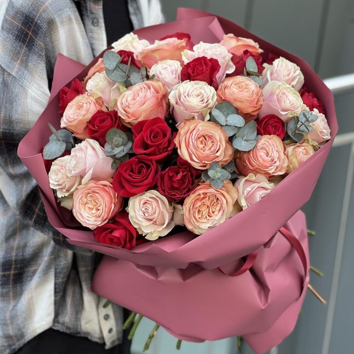 Букет из 3 видов роз и эвкалипта в оформлении!