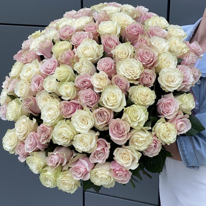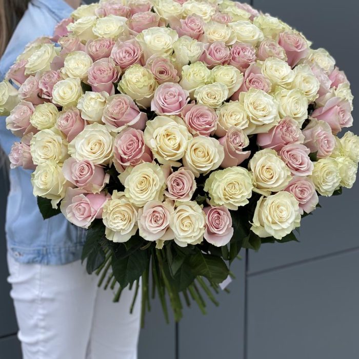 белая роза mondial – 51 шт. розовая роза pink mondial – 50 шт. Лента атласная – 1 шт.