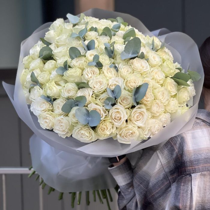 Роза белая – 151 шт. Эвкалипт – 4 шт. Оформление – 1 шт.