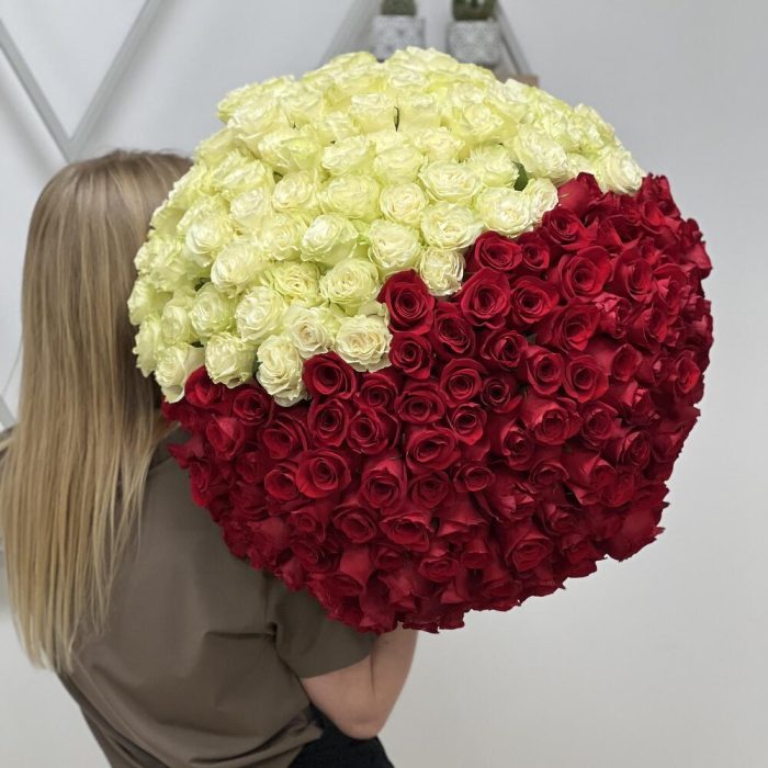 роза крансая – 101 шт. Роза белая – 100 шт. Оформление лента – 1 шт.