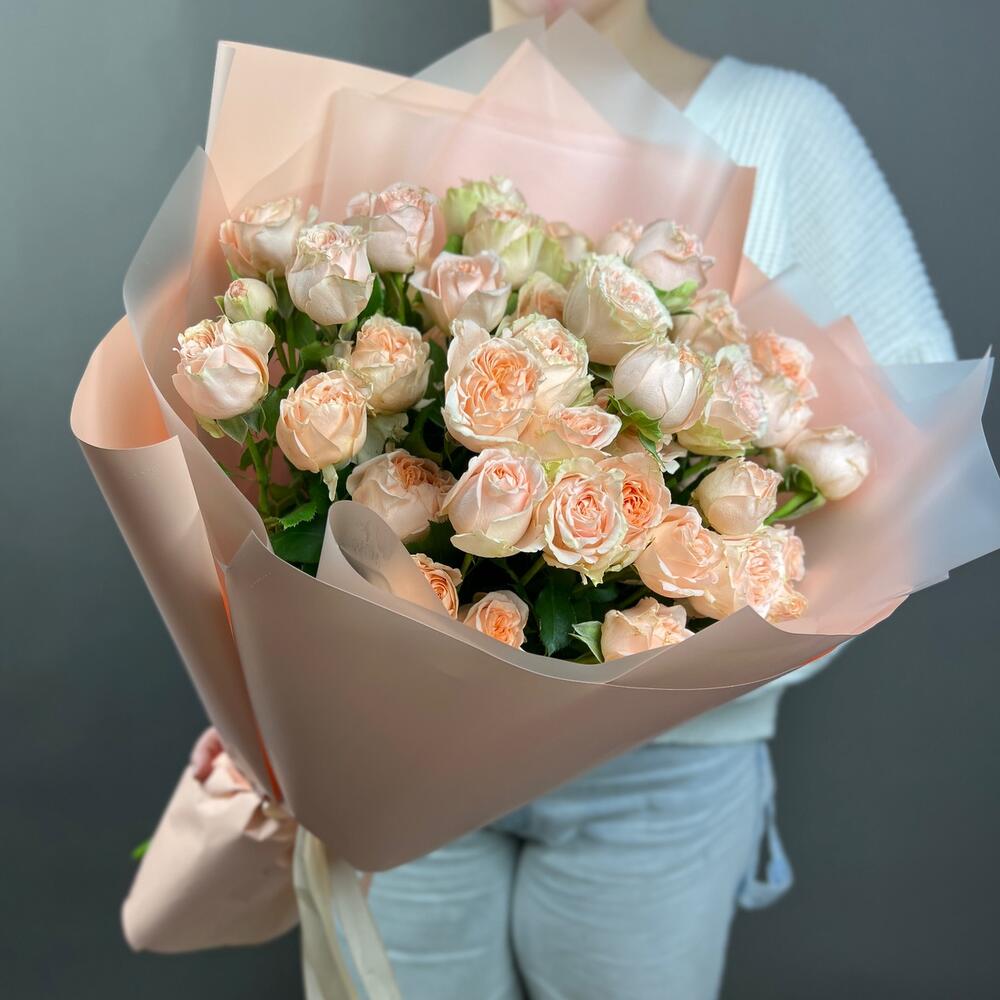 Лента атласная – 2 шт.Роза кустовая пионовидная – 9 шт.Пленка матовая – 5 шт.пленка полупрозрачная матовая – 4 шт.